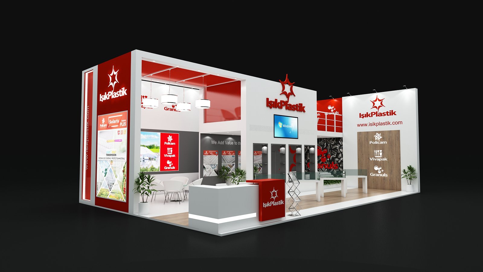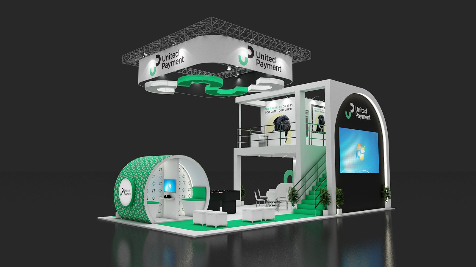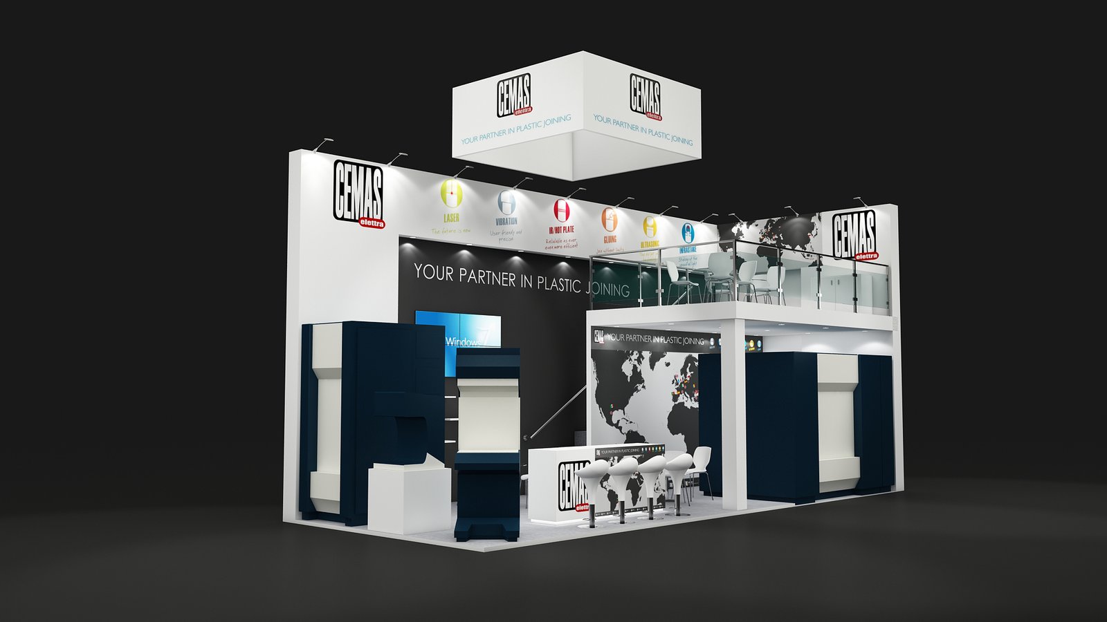 Our comprehensive booth double-deck building package includes design, engineering, fabrication, logistics, and complete on-site support.